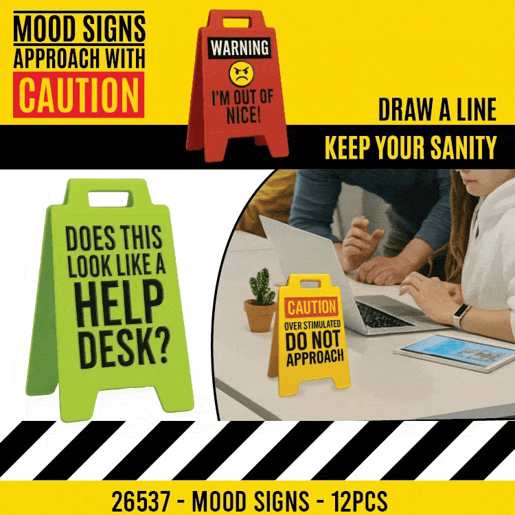 Warning: hilarity ahead! This 4.75 INCH 3D Standing Mood Caution Sign Assortment delivers cheeky, dimensional signs that humorously flag everything from coffee addiction to Monday blues. Each piece stands independently, making them ideal for desks, shelves, retail displays, and gift baskets. The vibrant designs and witty messaging appeal to office workers, students, and novelty enthusiasts. Comes retail-ready in a display-friendly pack—stock it and watch customers grab them for themselves or as gag gifts. Pure fun in compact form.