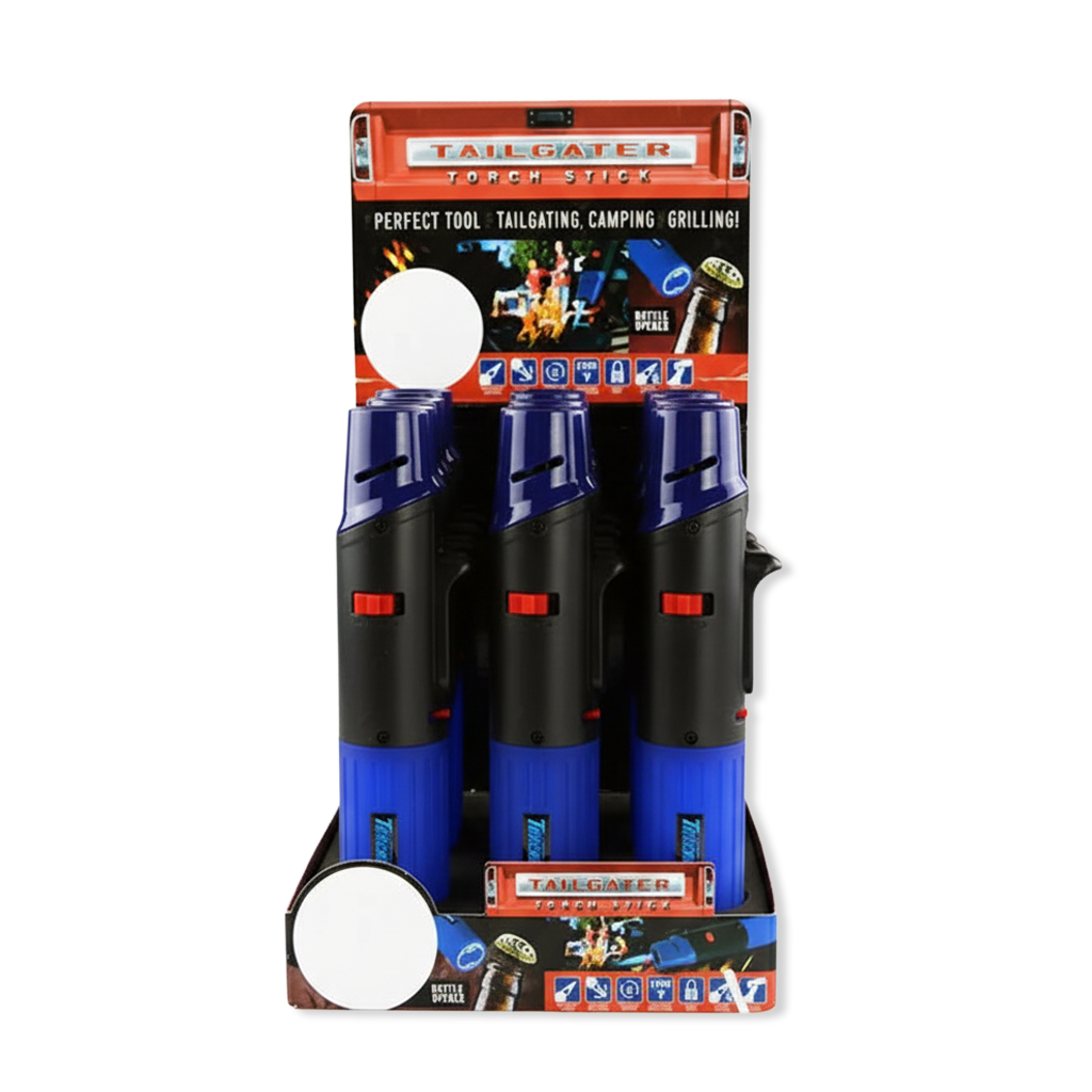 High powered refillable Tailgater Style Torch Stick with built in bottle opener. The perfect accessory for tailgating, camping, grilling and more. This 2300° blue torch flame can work at any angle and has a built-in safety lock.
