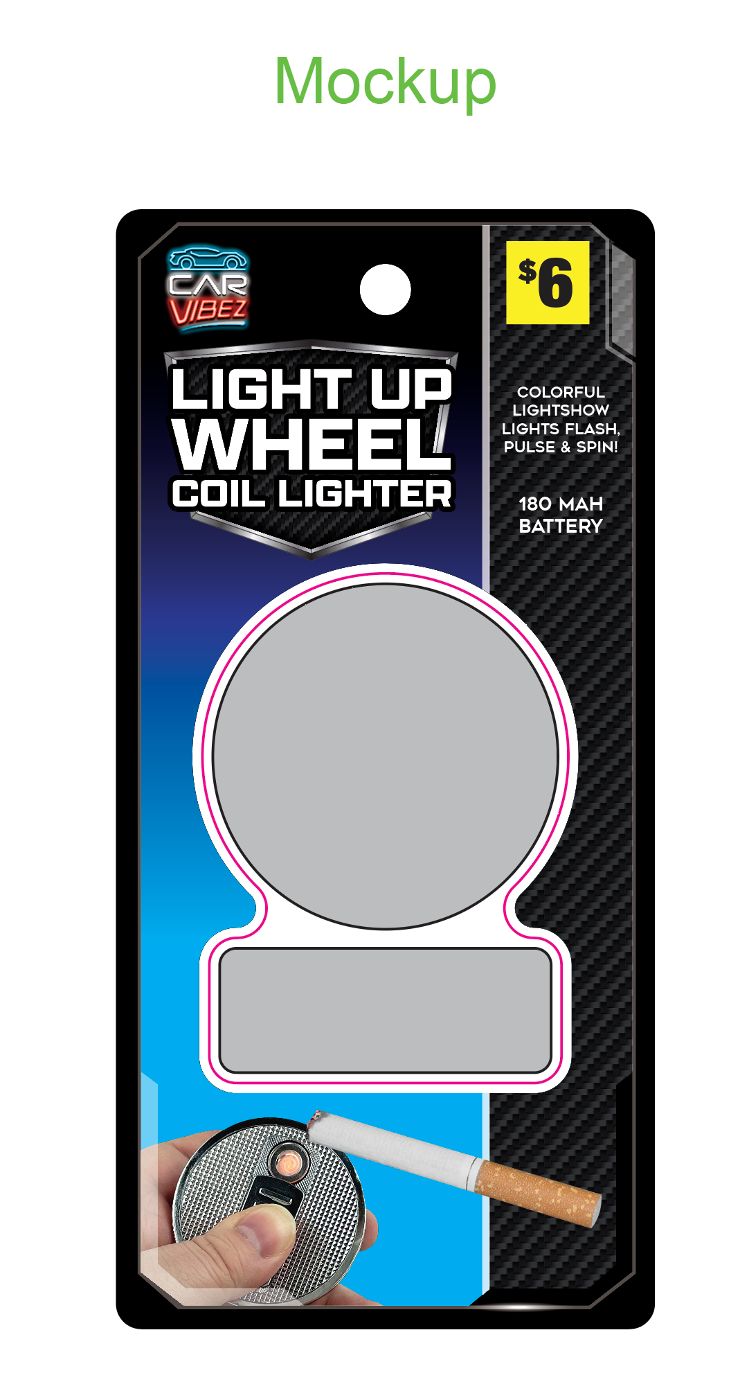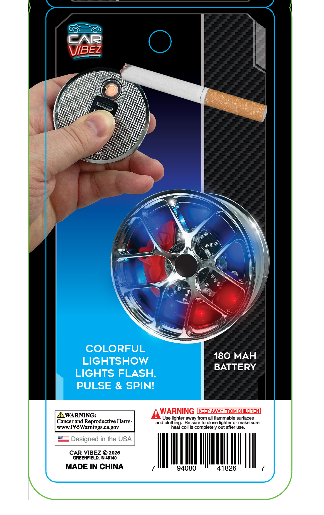 Experience the ultimate convenience and style with our Car Vibez Light-up Coil Lighter Wheel! With a rechargeable 180 mAh battery and realistic wheel styling, this electronic lighter provides a colorful light show as it lights up, flashes, pulses, and spins. Comes with a free charging cord for added convenience. Perfect for any car and travel enthusiast.