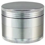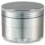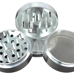 63 MM 4 piece grinder. Comes in a classic silver color. Made from durable, lightweight aircraft grade aluminum. Has fine metal screen and includes scraper tool. Assortment varies.