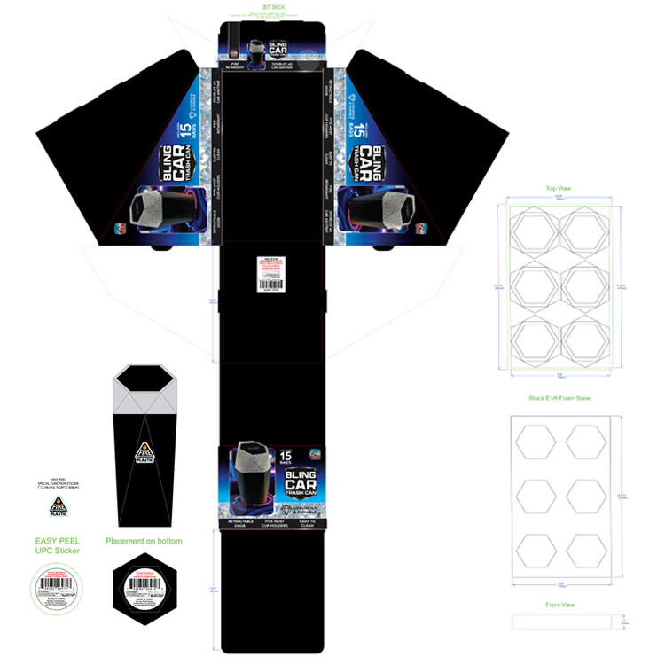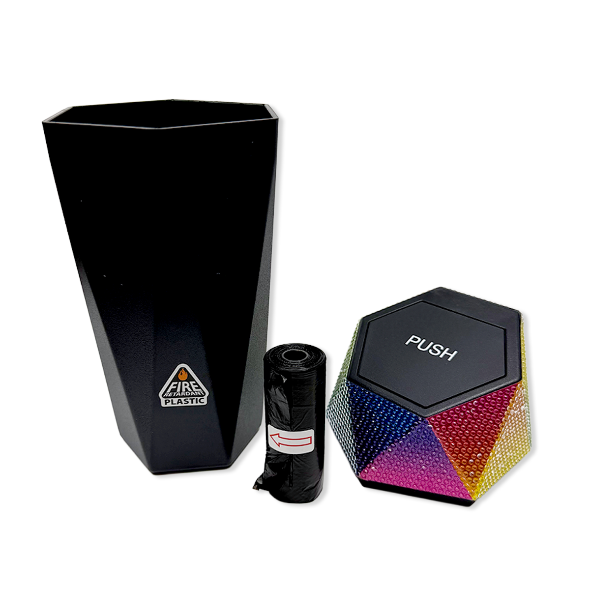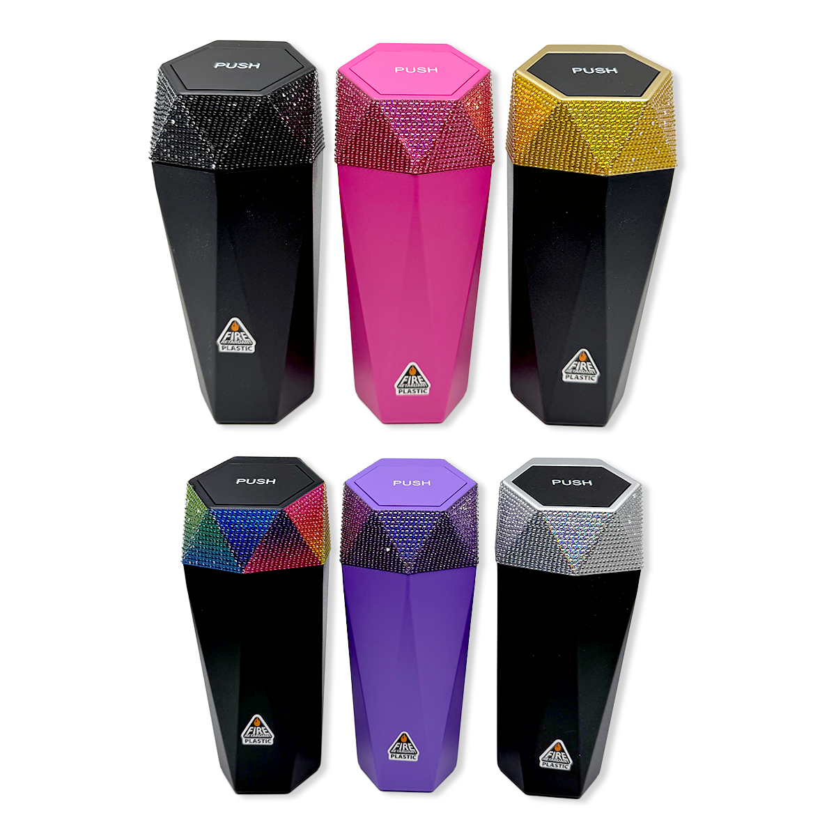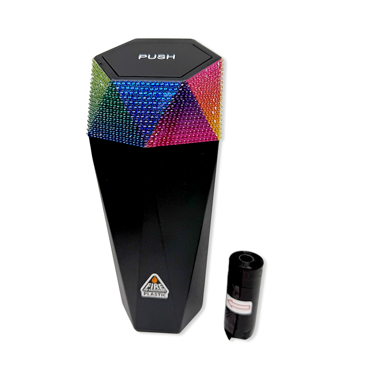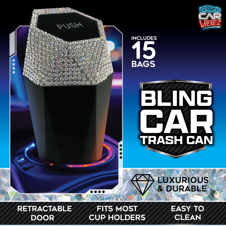 Keep your car clean and organized with our Mini Car Bling Trash Can Accessory! It fits most cup holders and features a retractable door for easy disposal. Made from fire retardant material, it also doubles as a cigarette butt bucket. Each Mini Trash Can comes with 15 mini trash bags!