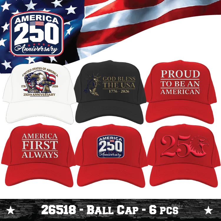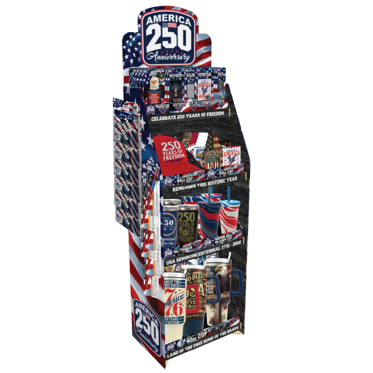Commemorate America's milestone with this striking USA 250 Floor Display—a retail-ready solution designed to capture customer attention and drive seasonal sales. Each kit includes patriotic product merchandised for immediate shelf placement, eliminating extensive setup time and maximizing floor impact. Perfect for retailers celebrating the nation's 250th anniversary, this display combines patriotic appeal with practical merchandising efficiency. Ideal for convenience stores, gift shops, and general retailers seeking turnkey promotional solutions that resonate with customers during this historic moment.