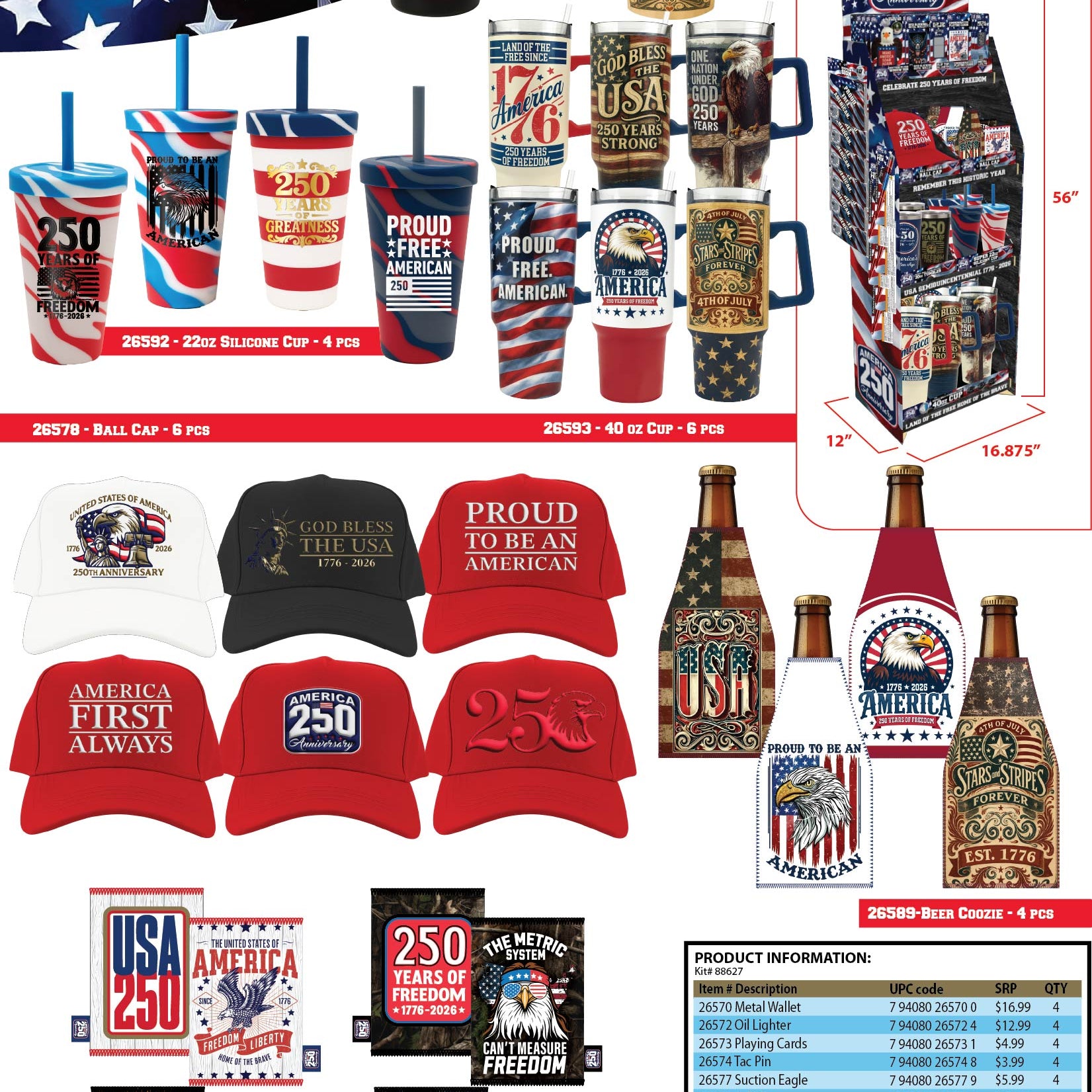 USA 250 All-American Baseball Caps are perfect for outdoor activities like fishing, hunting, baseball games, mowing, driving and more. Made with heavy duty canvas and breathable mesh. Adjustable fit. Each display offers a variety of patriotic designs.